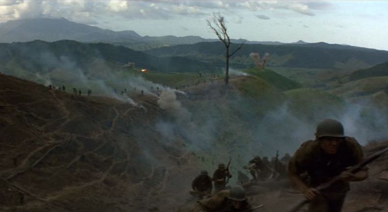 The Thin Red Line is a stark contrast from Guadalcanal Diary, as I mentioned before. While Guadalcanal Diary almost felt like a walking, moving recruitment poster, The Thin red line kind of depicted the greatest generation for what it truly was. Men and women who were witnessing the world tear itself apart piece by piece. (COMMENT: Let’s face reality folks, we as a country have been known to put the “Greatest generation” on a pedestal. And Tom Brokaw didn’t do any favors with his book of that same title) I’m not denying that they truly did great things. They moved heaven and earth, and they banded together to get it done. However, they didn’t have a choice. In a situation like World War II, the world really was tearing itself apart. And that generation had to choose which side they were on. Terence Malick gave us that exact representation. When I say that The Thin Red Line thrives on the humanity, I mean it. True, it does focus on the United States perspective. But it does not villainize the Japanese forces, because the Japanese forces were following orders, just like the United States forces were.
